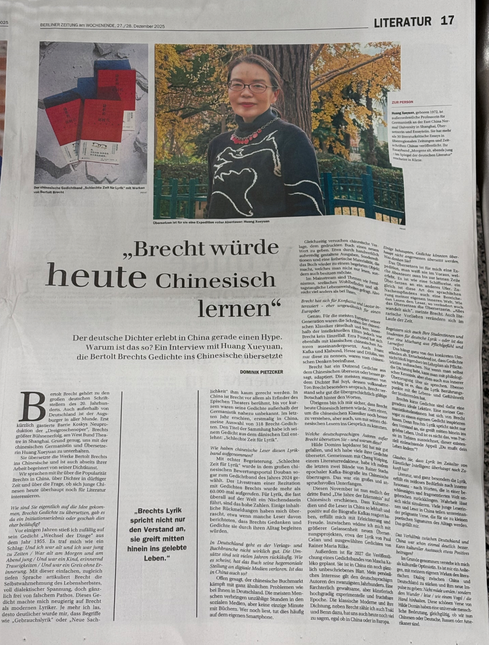 德国诗人布莱希特在中国正掀起一股热潮。原因何在?本文专访了布莱希特诗歌的中文译者黄雪媛女士。
