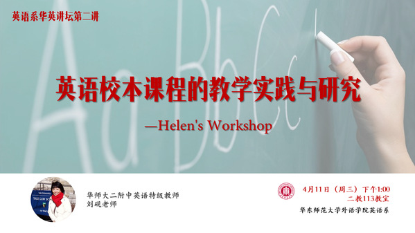 4月11日,英语系华英讲坛第二讲开讲。来自华师大二附中的英语特级教师刘砚老师以她开设的英语诗歌写作课程Helen’s Workshop为例,给英语系的学生作了“英语校本课程教学的实践和研究”的讲座。