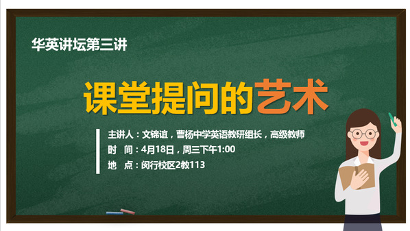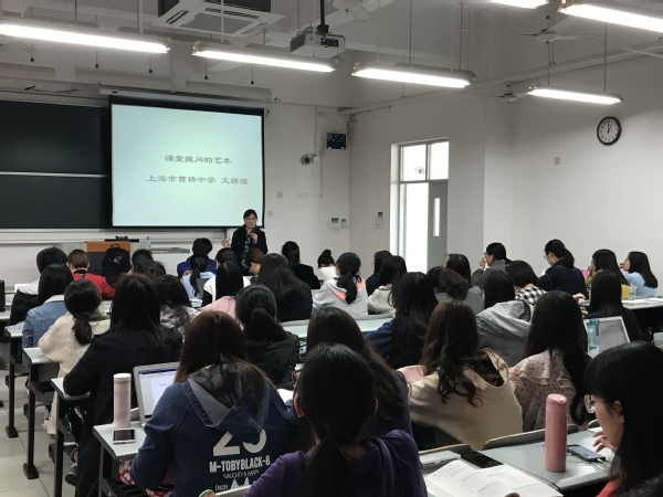 4月18日,英语系华英讲坛第三讲开讲。曹杨中学的英语教研组长、高级教师文锦谊给英语系的学生作了“课堂提问艺术”的讲座。