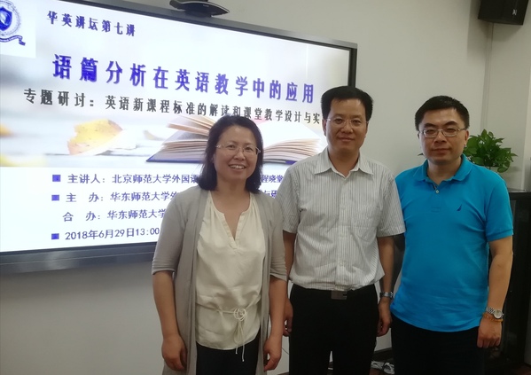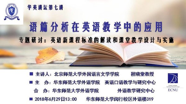 英语口语教学与研究中心及外语教学研究中心联合承办。本次受邀主讲人为北京师范大学外国语言文学学院教授、学术委员会主任程晓堂教授。程教授对功能语言学、外语教育有着深刻的研究,此次带来题为“语篇分析在英语教学中的应用”的讲座,通过理论以及实例的结合,给未来的英语教学指引了一个新的方向。